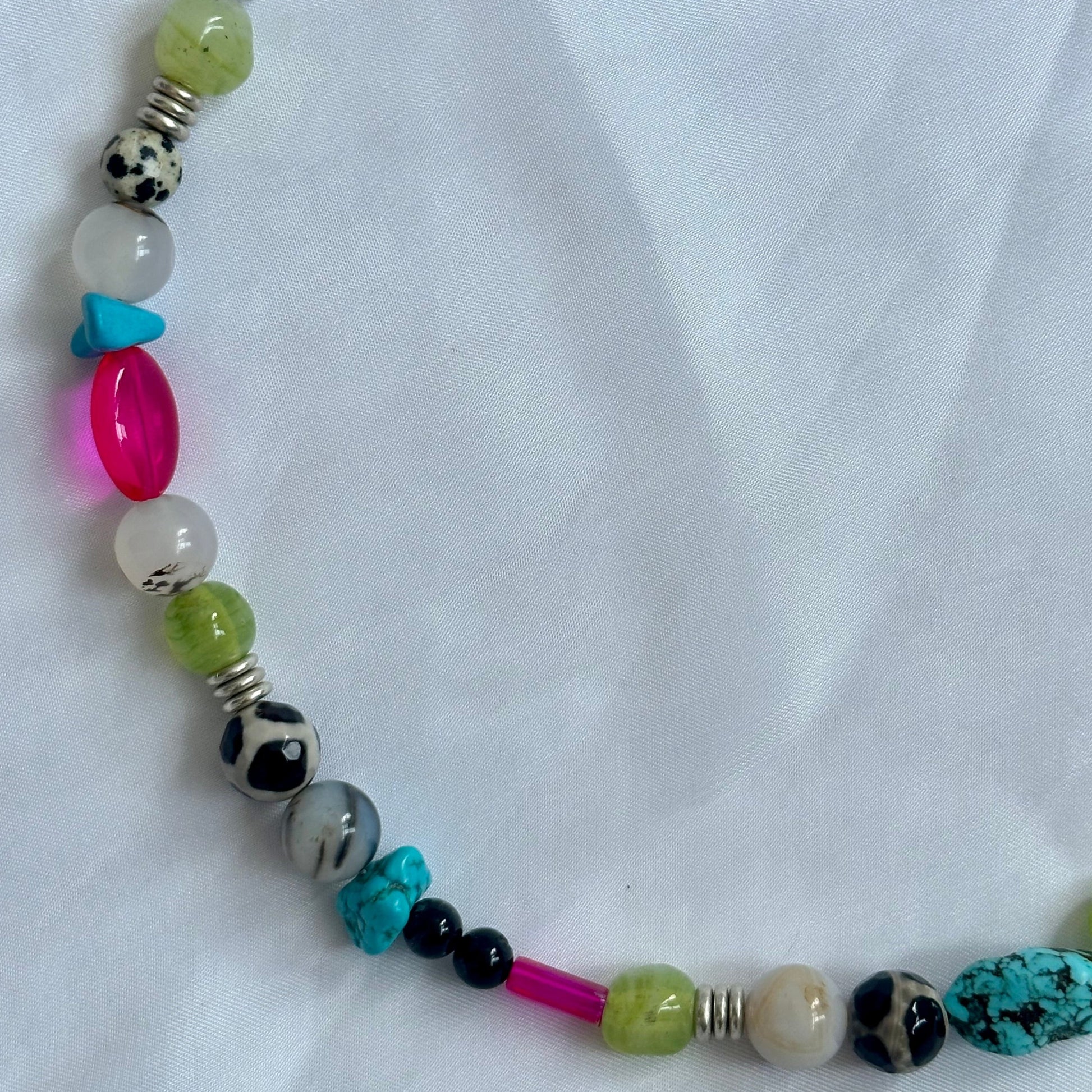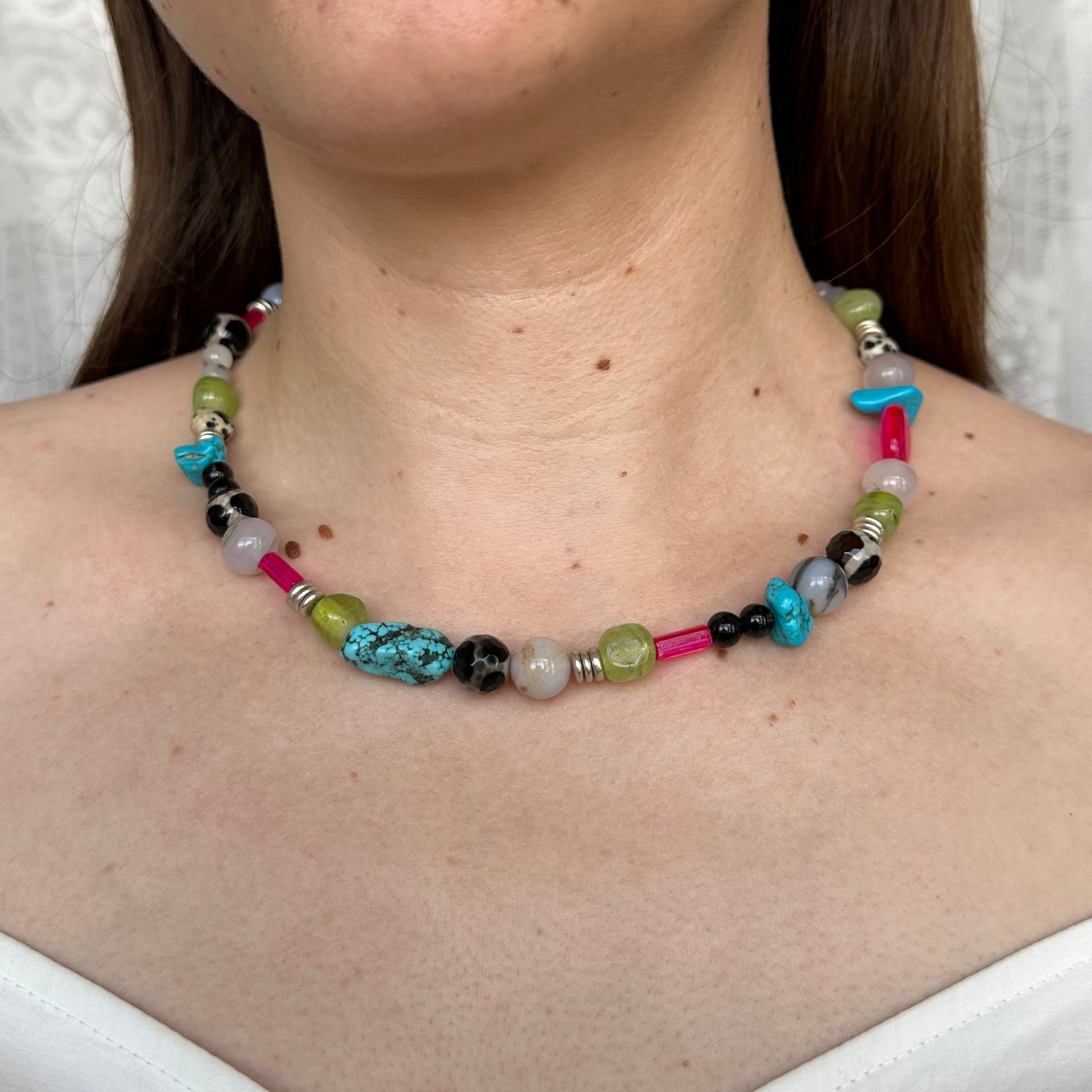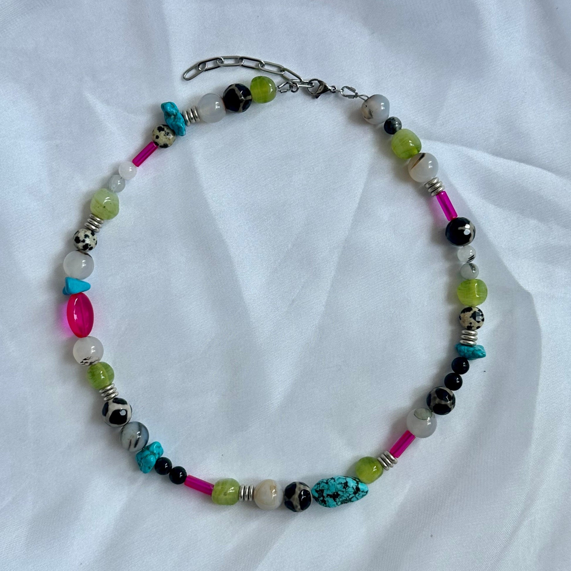17.5" with 2.5" extender. Made with semi-precious stone (agate, dalmatian amazonite, turquoise, quarts), metal (sterling silver plated), and glass beads.