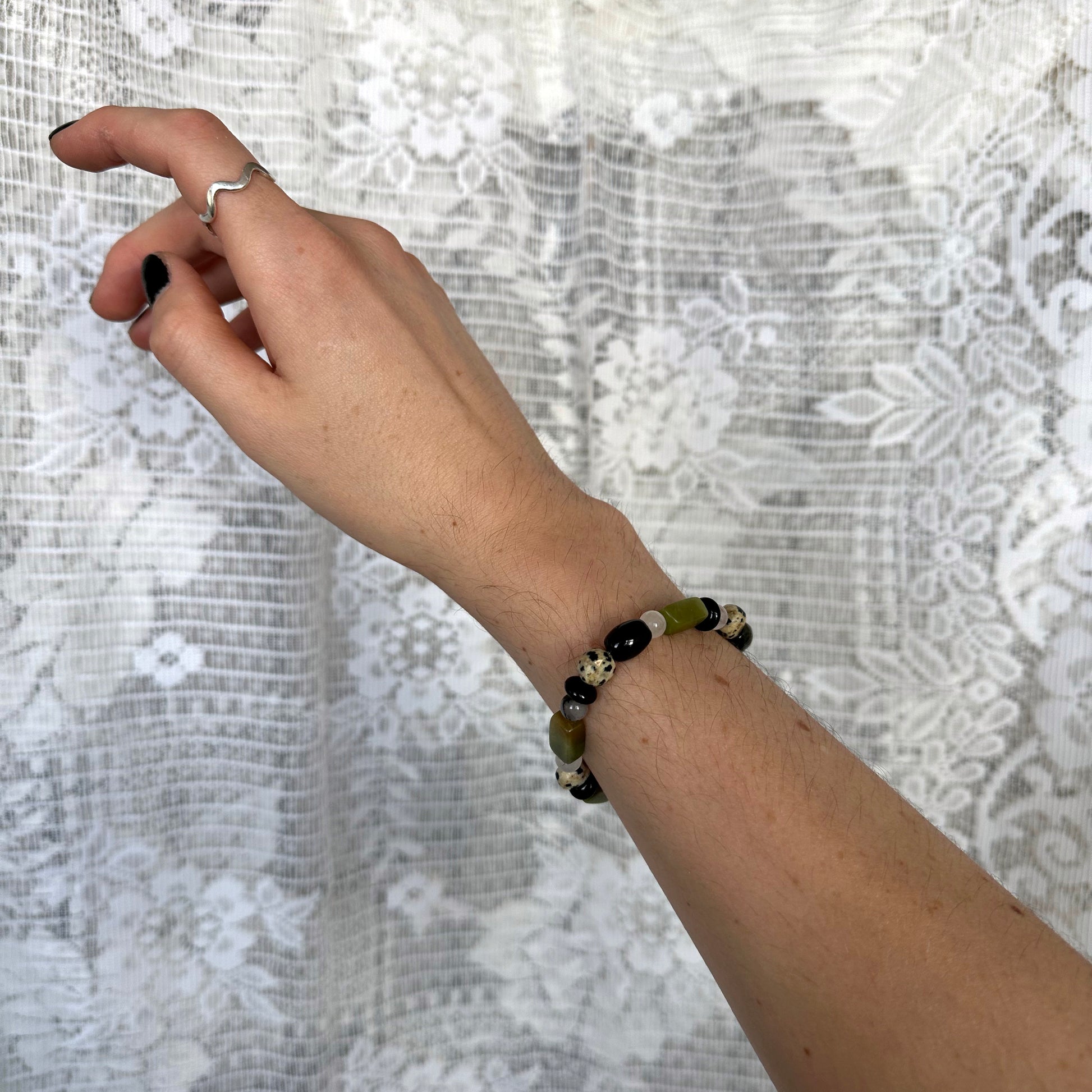8-9" elastic bracelet. Made with semi-precious stones (agate, serpentine, amazonite, dalmatian jasper, onyx)