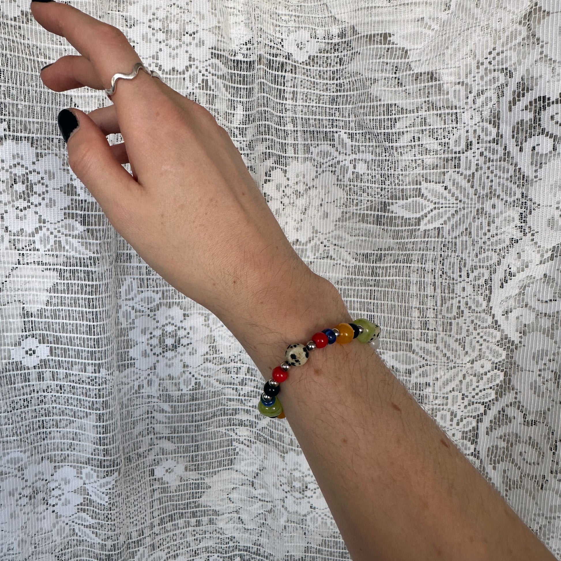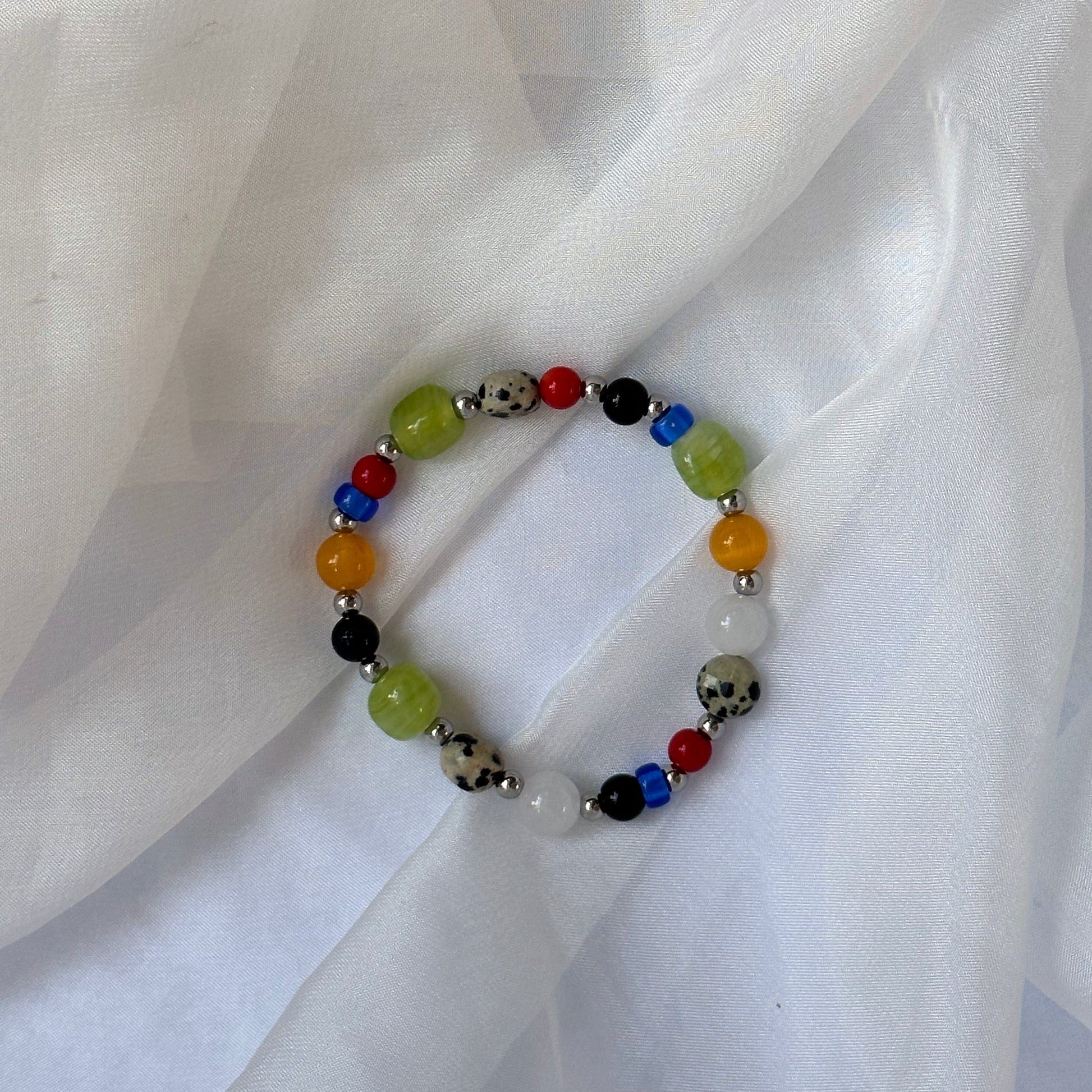 8-9" elastic bracelet. Made with semi-precious stones (onyx, dalmatian jasper, and quartz) and stainless steel beads