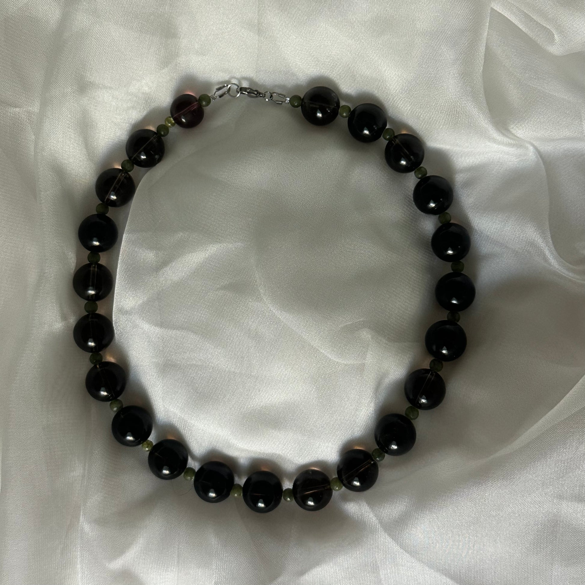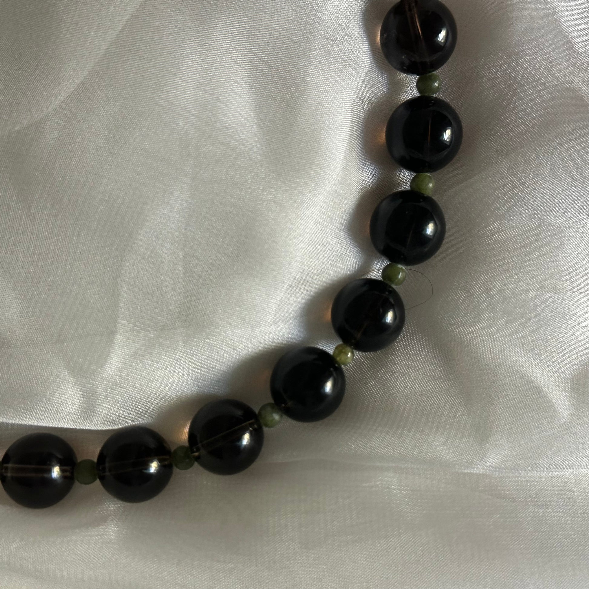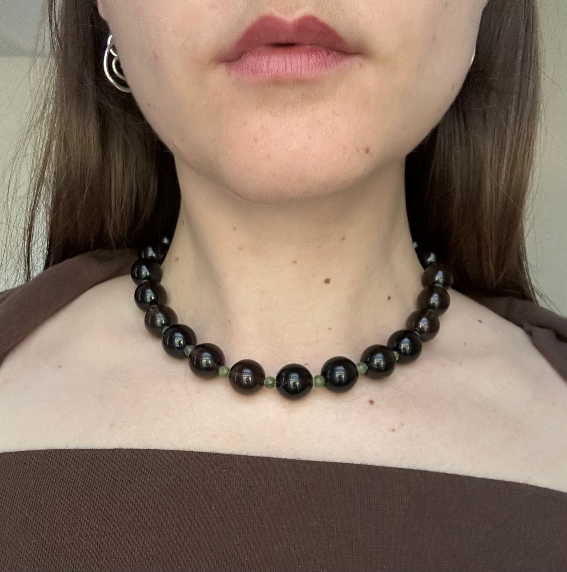 15" with 2.5" extender. Made with semi-precious stone and glass beads.